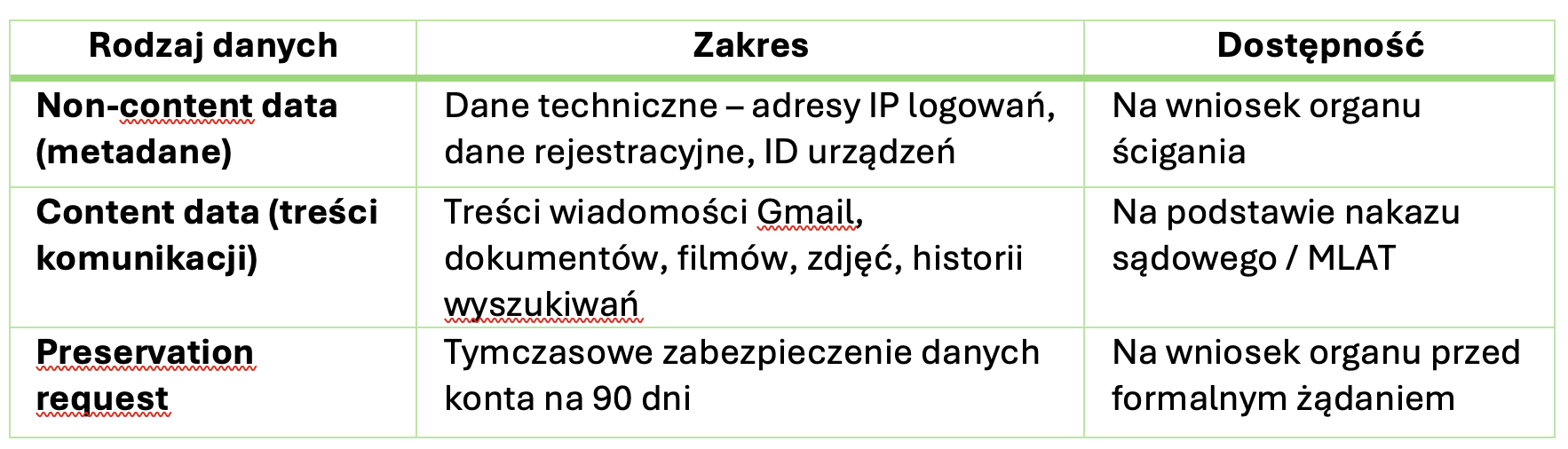- Zachowaj rozdział danych – osobny wniosek dla non-content (technicznych) i content (treściowych).